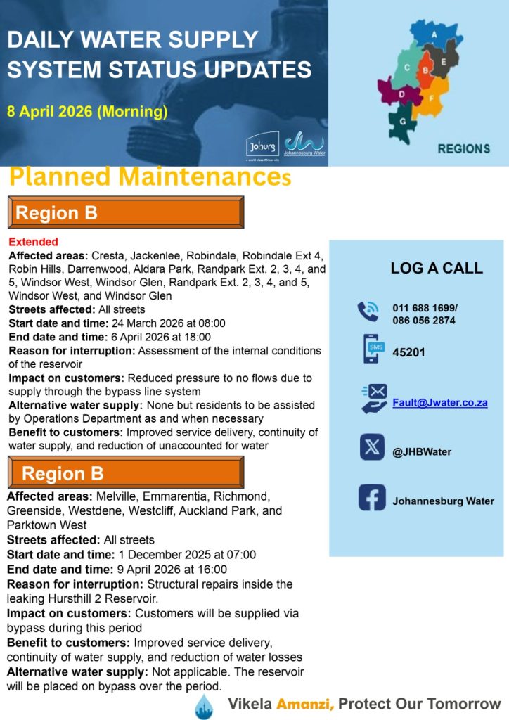 Joburg Water: Planned Maintenance – 8 April 2026